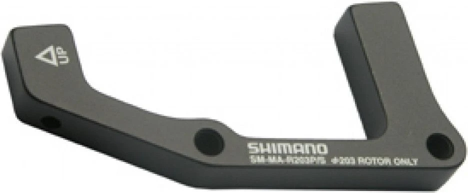 Shimano adaptor to mount a 74mm post mount caliper to a 51mm international standard frame mount to accomodate a 203mm disc.