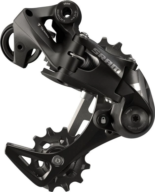 The 7-speed Sram X01 DH X-Horizon™ rear derailleur makes shifting smooth and reliable no matter where you ride. Engineered to maintain consistent chain gap across all seven gears, X-HORIZON™ eliminates vertical movement for faster shifting, reduced shift force and an end to ghost shifting. Our new, Type-3 ROLLER BEARING CLUTCH™ features a smoother torque curve for a quieter, more consistent operation and feel. The 12-tooth X-SYNC™ pulley wheel holds the chain in place, reducing bounce and chain slap. And CAGE LOCK™ technology makes wheel removal and installation easier than ever. Paired with the X01 DH 7-speed shifter, X-HORIZON™ forms the backbone of X-ACTUATION™ technology—and that means completely smooth shifting action.
